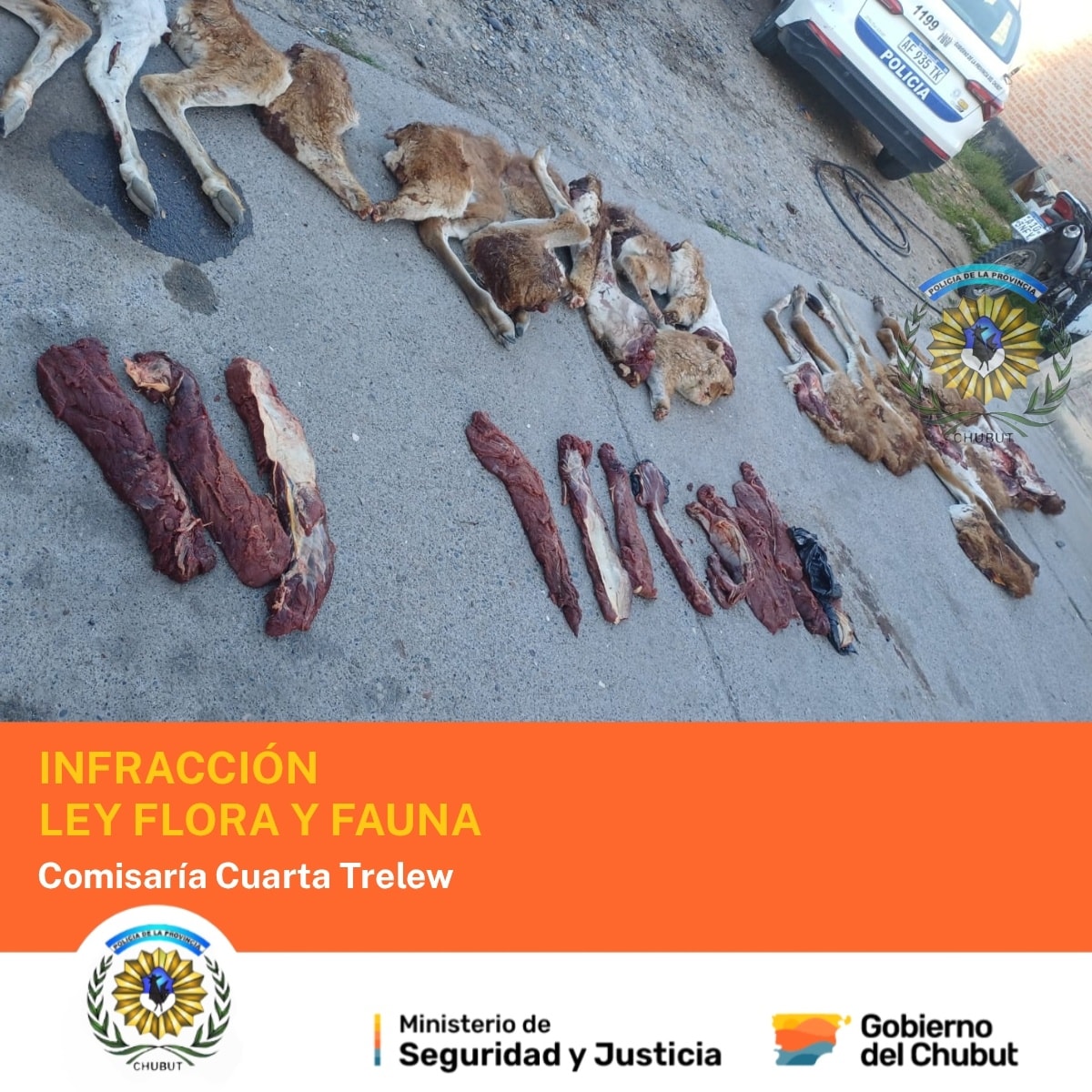 Catorce cuartos, trece paletas y trece lomos de guanaco y un arma de fuego secuestrada fue el saldo de un procedimiento que en la tarde de este sábado efectuaron efectivos policiales de la comisaría Cuarta de Trelew sobre la Ruta Nacional Nº 3.