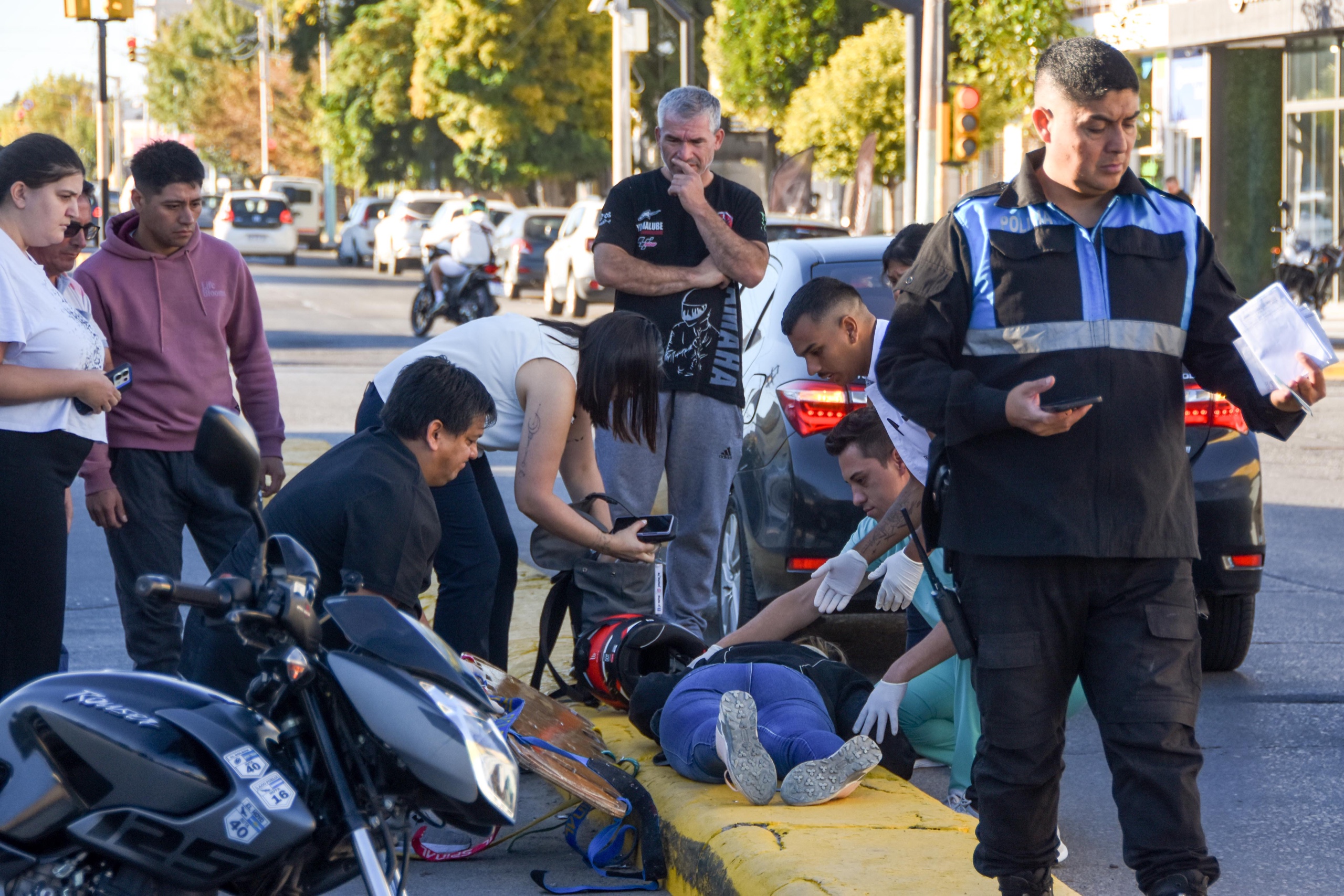 Una motociclista quedó tendida en el suelo tras chocar una camioneta en Avenida Yrigoyen y Brasil de Trelew. Personal policial se hizo presente en el lugar y la mujer debió ser trasladada al Hospital Zonal de Trelew por presentar dolencias en su cuerpo.