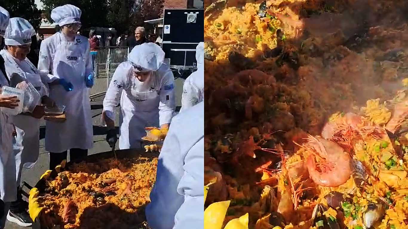 Sebastián Villagra, encargado de la elaboración de la gigantesca paella, enumeró todos los ingredientes y frutos de mar que la componen, como pollo, arroz, langostinos, berberechos, y mejillones entre otros.