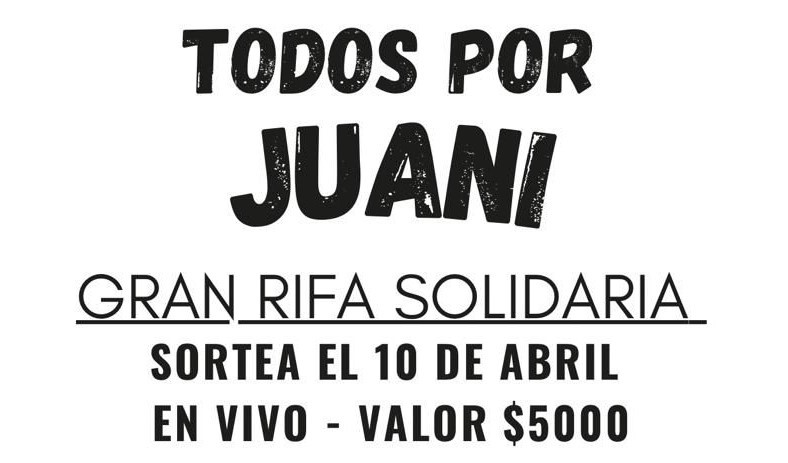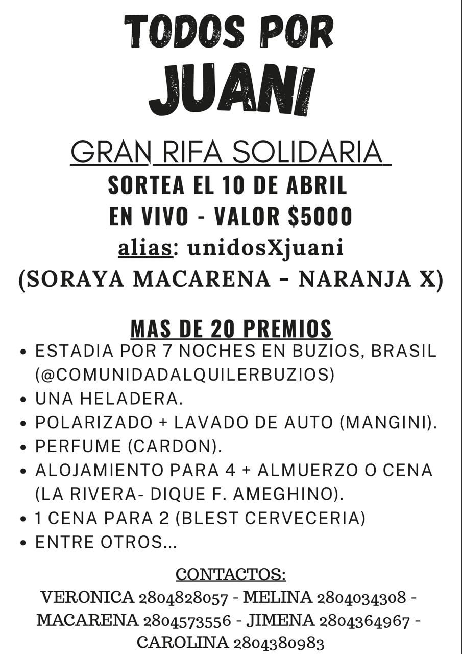 Quienes deseen colaborar pueden adquirir números a través del alias unidosXjuani (a nombre de Soraya Macarena – Naranja X) o comunicarse con los organizadores: Verónica (2804828057), Jimena (2804364967), Melina (2804034308), Macarena (2804573556) y Carolina (2804380983).
