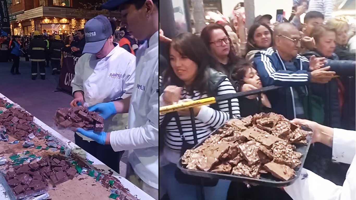Unos 200 maestros chocolateros elaboraron 221 metros y dos toneladas de chocolate artesanal y más de dos cuadras de pura delicia que fue repartida este viernes entre el público.