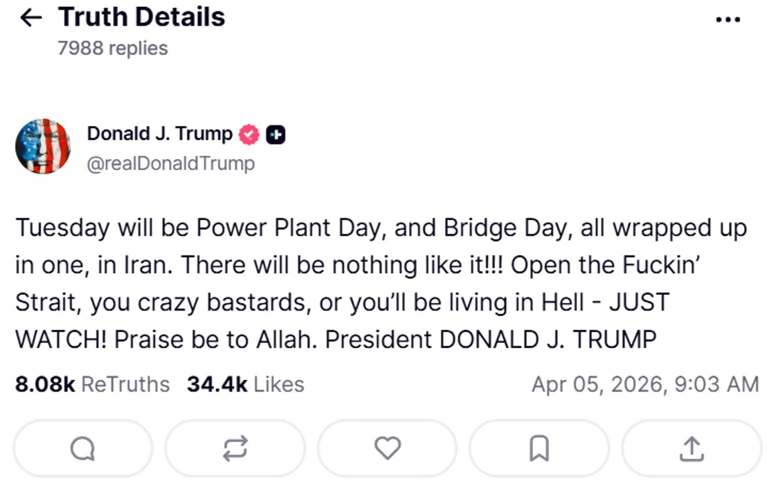 En un mensaje que sacudió a los mercados internacionales y a las cancillerías globales, Trump detalló que el próximo martes podría convertirse en el "Día de las plantas eléctricas y el Día de los puentes" en Irán, sugiriendo que los objetivos de un posible bombardeo ya han sido seleccionados.