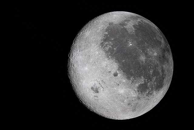 La cara visible, a la derecha, se identifica por las manchas oscuras que cubren su superficie, formadas al principio de la historia de la Luna, cuando era volcánicamente activa. Esta es la cara de la Luna que podemos ver desde la Tierra.