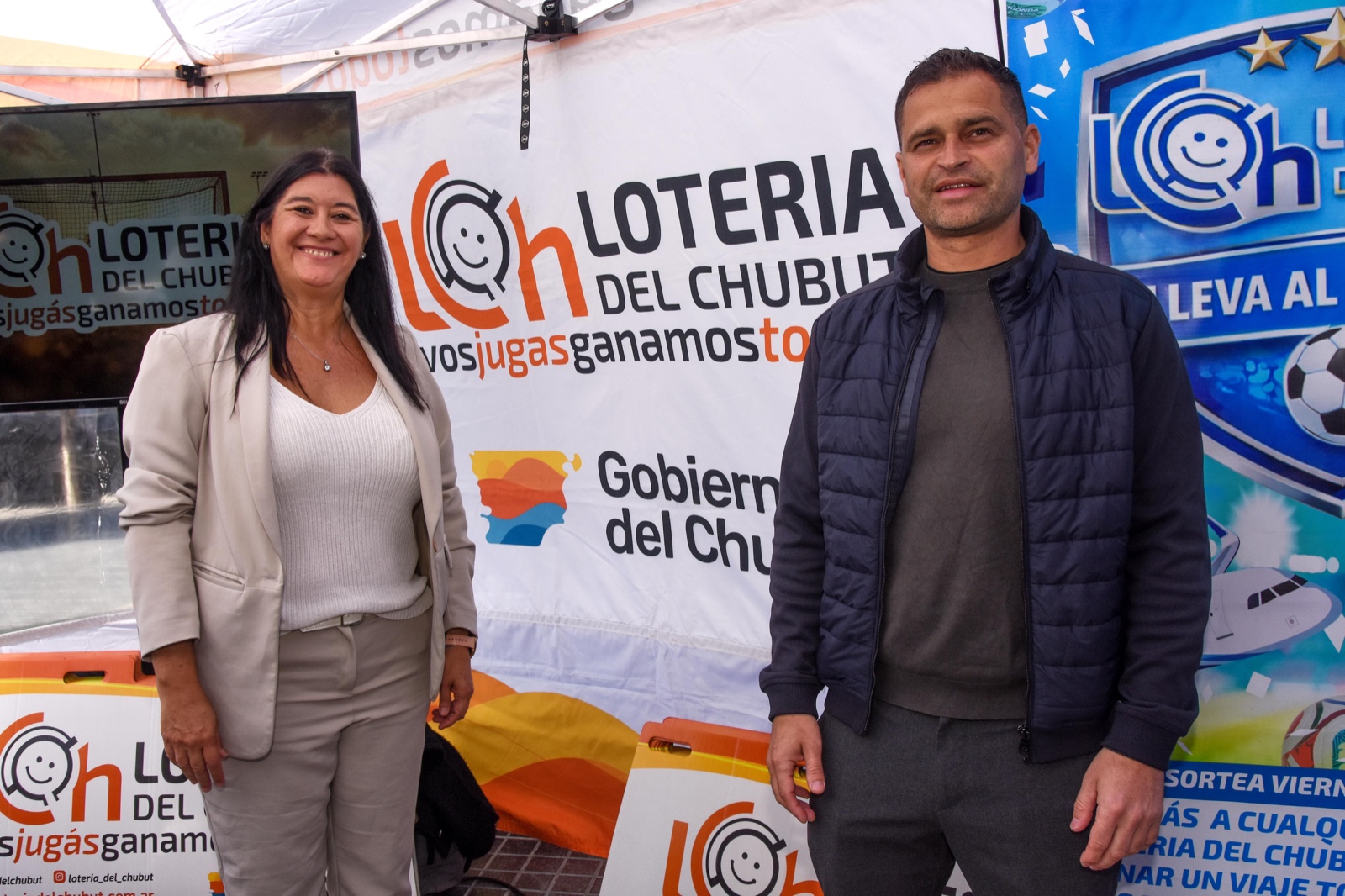 El presidente del Instituto de Asistencia Social (IAS) - Lotería del Chubut, Ramiro Ibarra, junto a la secretaria de Bienestar Integral de la Municipalidad de Trelew, Mariana Medina, presentaron el evento que conmemorará la Primera Línea que se jugó en diciembre de 2001 en el Club Huracán de esa ciudad.