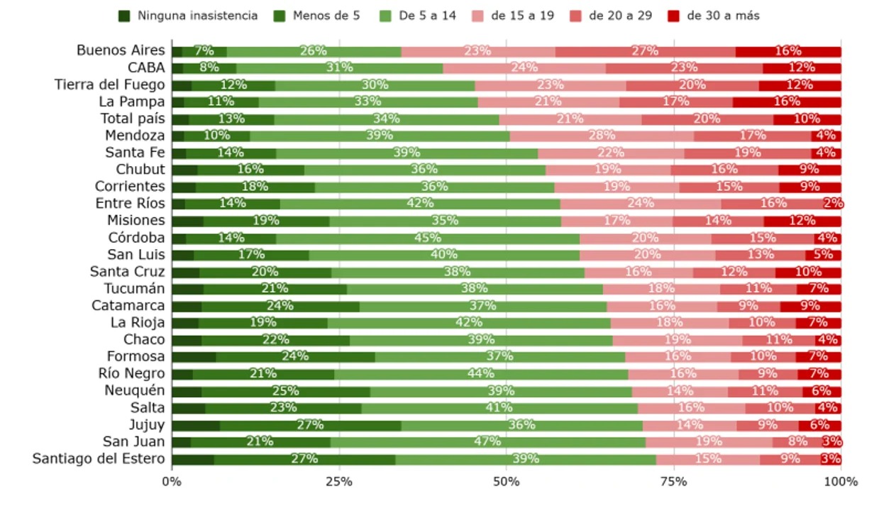 Buenos Aires encabeza el ranking con un 66% de estudiantes que acumulan al menos 15 faltas, seguida por la Ciudad de Buenos Aires (59%), Tierra del Fuego (55%) y La Pampa (54%).