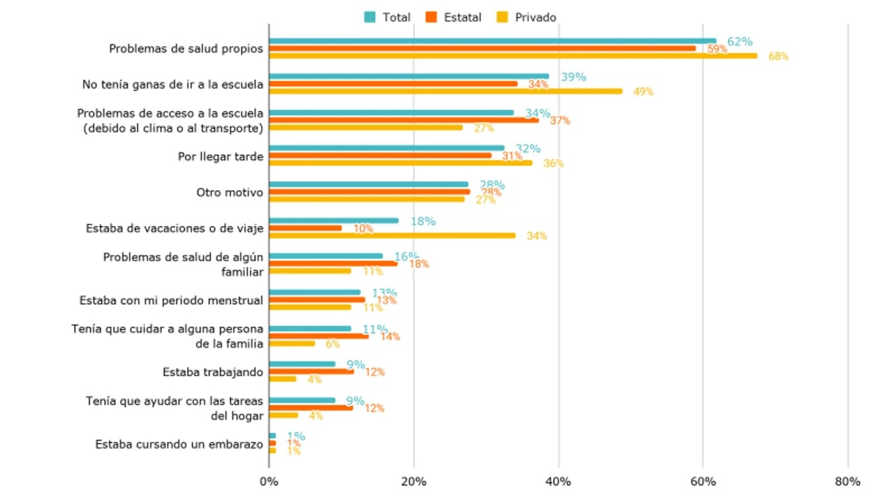 En quinto lugar, aparecen “otros motivos” y en sexto lugar, estar de viaje o vacaciones donde los estudiantes de escuelas de gestión privada lo señalan con mayor intensidad.
