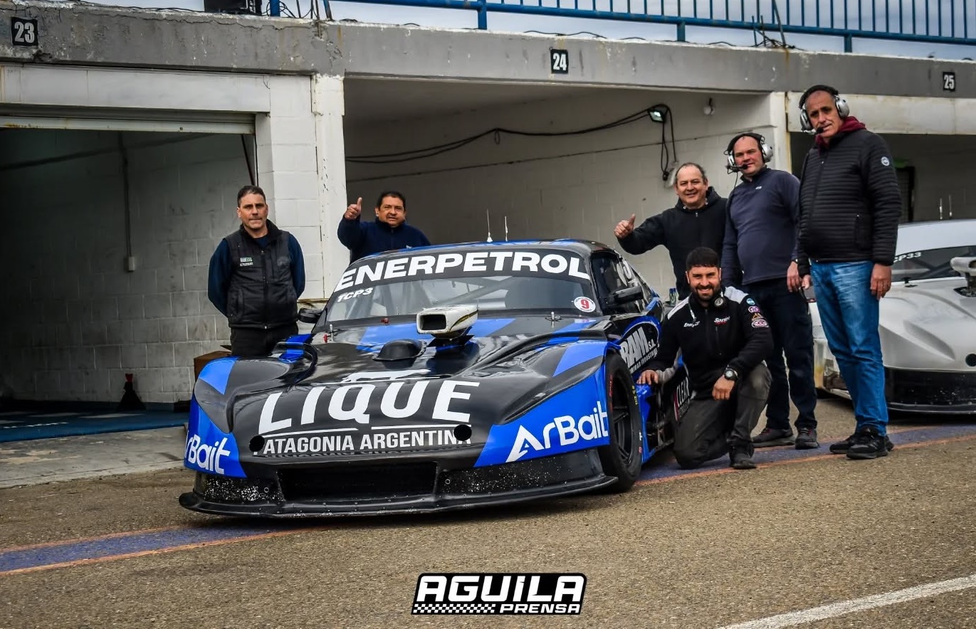 El Chevrolet de Emiliano López y parte de su equipo campeón del TC Patagónico.