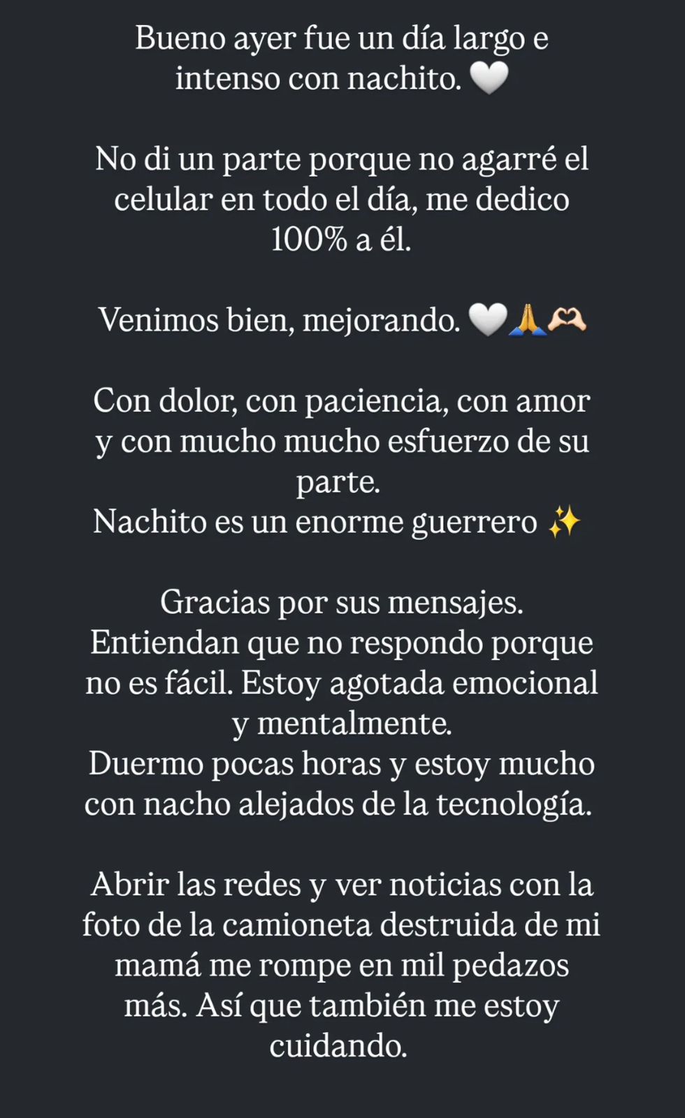 Pide también en el texto que “entiendan que no respondo porque no es fácil. Estoy agotada emocional y mentalmente. Duermo pocas horas y estoy mucho con Nacho alejados de la tecnología. Abrir las redes y ver noticias con la foto de la camioneta destruida de mi mamá me rompe en mil pedazos más. Así que también me estoy cuidando. Ojalá esta pesadilla termine pronto”, expresó.