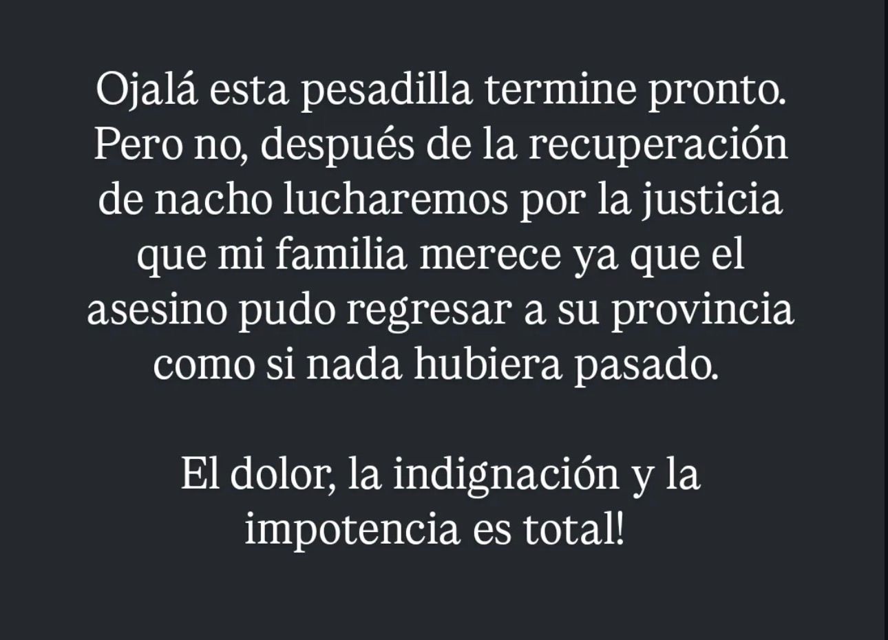 Adelantando los difíciles días que deberán atravesar, esperando el alta y traslado del niño a Trelew, dijo “lucharemos por la justicia que mi familia merece ya que el asesino pudo regresar a su provincia como si nada hubiera pasado. El dolor, la indignación y la impotencia es total. A nosotros solo nos queda confiar en la justicia. Mi familia merece descansar en paz. Nosotros merecemos paz”, reveló.
