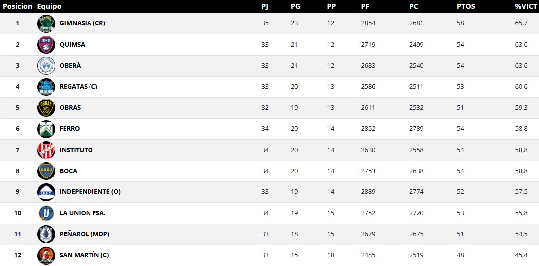 El elenco chubutense volvió a perder luego de 10 triunfos pero se mantiene en la cima con un récord de 23 victorias y 12 derrotas. Lo escoltan Quimsa y Oberá con 21-12. A Gimnasia le queda un sólo partido por delante, será el próximo viernes 17 ante Argentino de Junín en Comodoro.