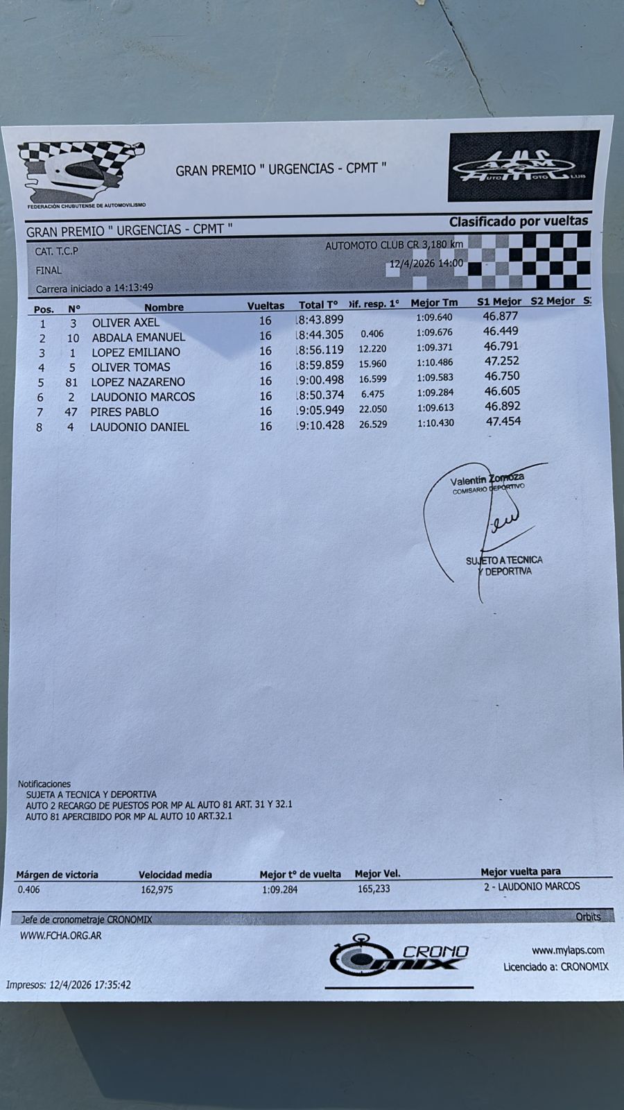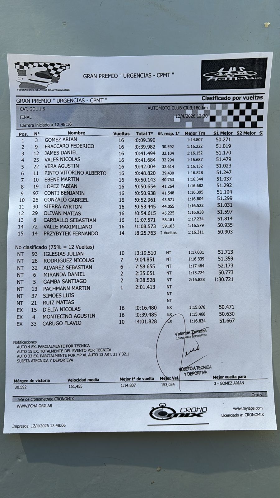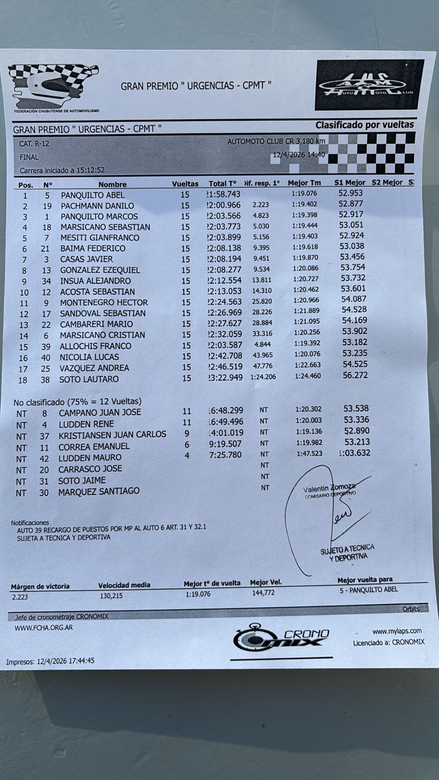 Pero como las carreras en la técnica, la revisión arrojó dos exclusiones, la del segundo Nicolás D' Elía de manera definitiva y de Agustín Montesino de manera parcial, según el informe posterior.