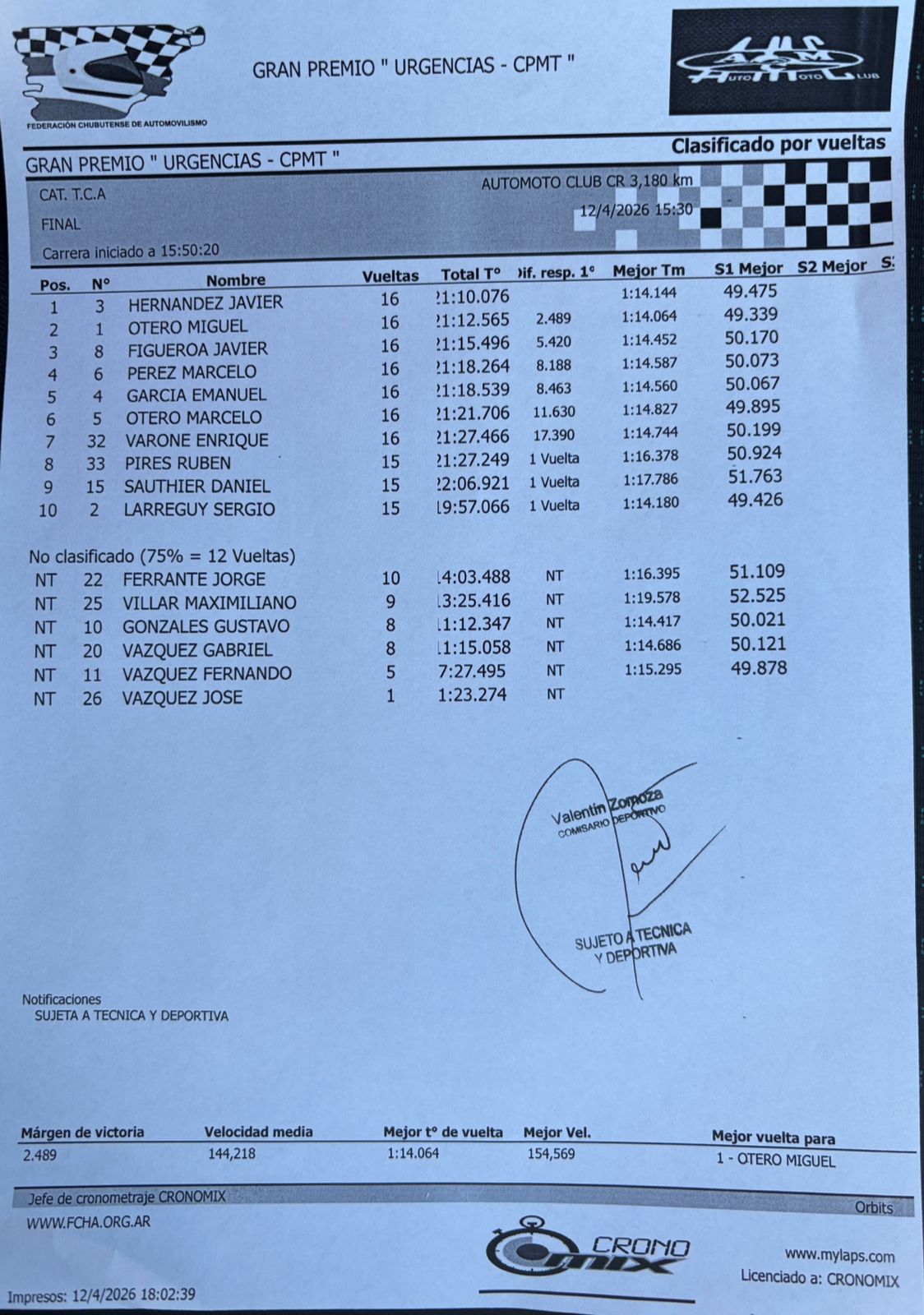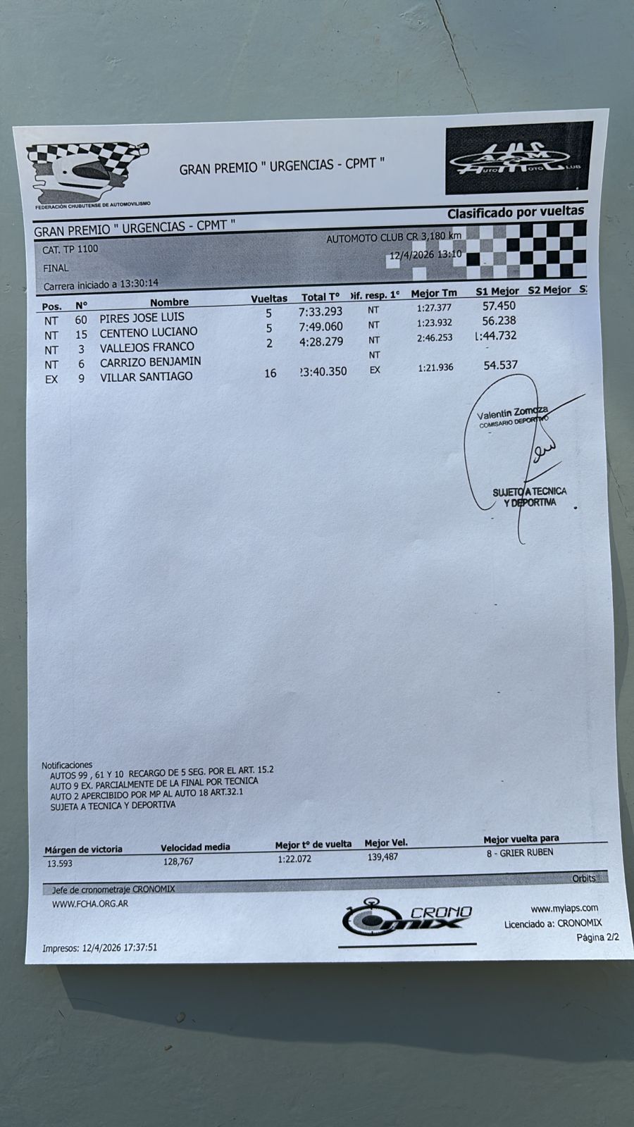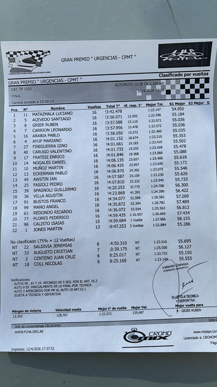 Pero como las carreras en la técnica, la revisión arrojó dos exclusiones, la del segundo Nicolás D' Elía de manera definitiva y de Agustín Montesino de manera parcial, según el informe posterior.