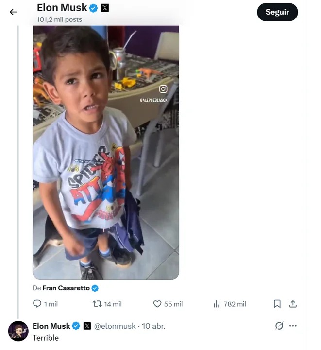 “Terrible”, fue lo que manifestó Musk en un video publicado por una usuaria de la red social X, en el que habla sobre el caso del pequeño que murió en la ciudad chubutense y del feminismo, supo la agencia Noticias Argentinas.
