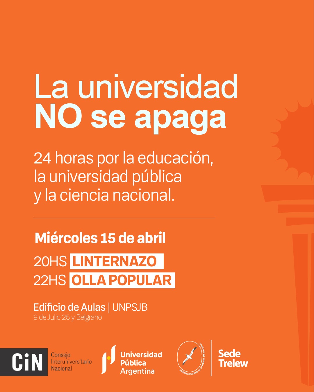 “Principalmente a las 20 horas convocamos a toda la comunidad a un linternazo que vamos a hacer en el estacionamiento de la sede y después del linternazo y la recorrida vamos a hacer una olla popular donde va a haber comida para todos los participantes”, mencionó Gabriel Yapur delegado zonal de la UNPSJB.