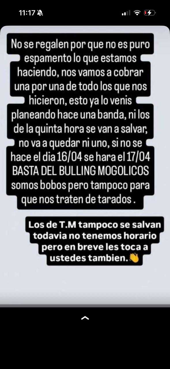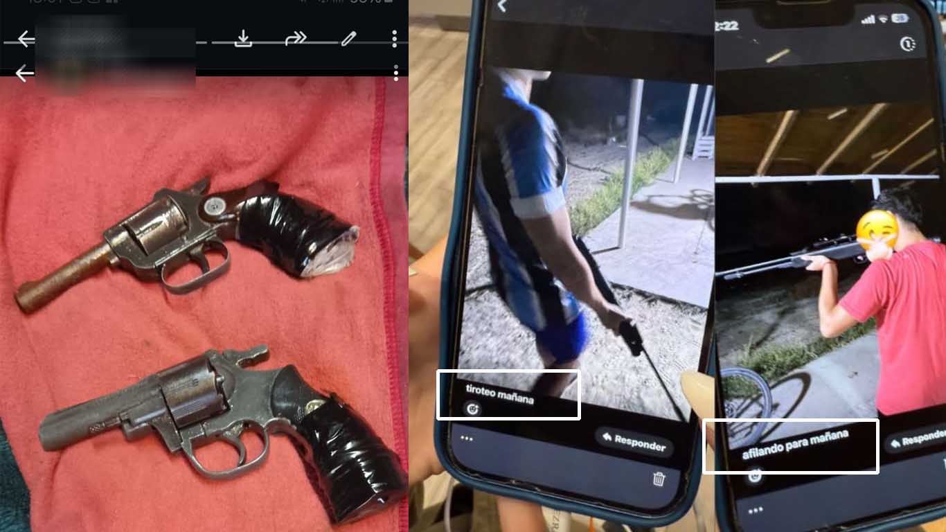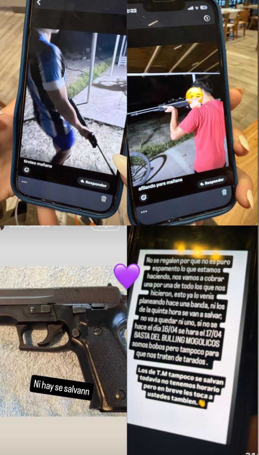 Pero todo esto no terminó ahí. Por estas horas, circula en las redes, material con imágenes de un joven empuñando un rifle, exhibiendo dos revólveres y lanzando una amenaza clara: “Nos vamos a cobrar una por una todas las que nos hicieron” o “Si no se hace el día 16, será el día 17”. “Basta de bullying”, fueron algunas de las frases que se leen en el texto que ya les llegó a algunos alumnos de la 714.