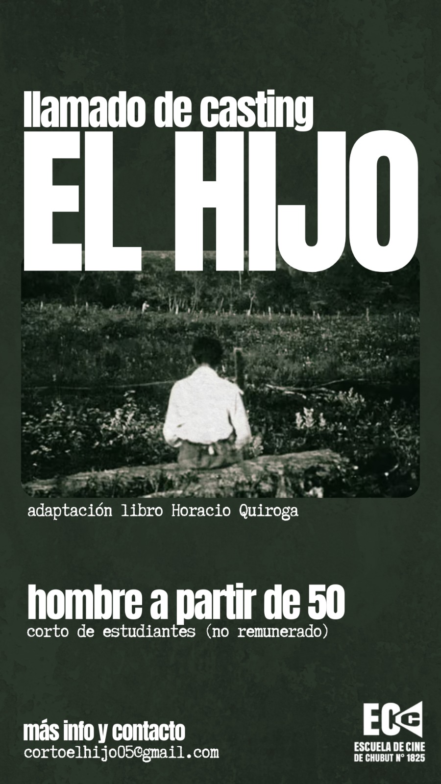 Se trata de una convocatoria con miras a la realización de un cortometraje basado en la obra "El hijo2 de Horacio Quiroga.El objetivo es cubrir un personaje de alrededor de 50 años, por lo que sebusca un actor masculino, de 50 años para el rol de Claudio (padre), con disponibilidad para ensayos y rodaje a coordinar.