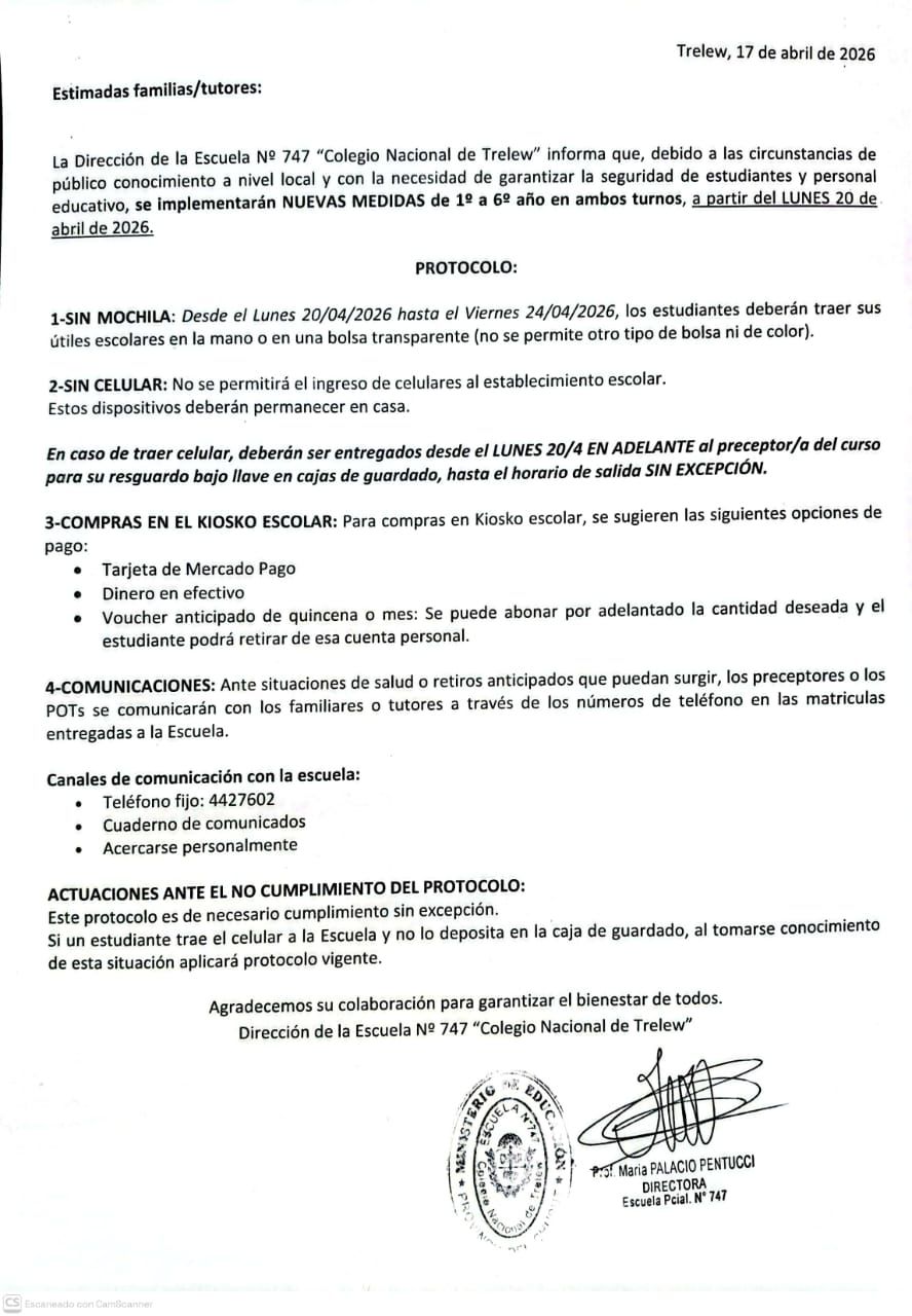 La Dirección de la Escuela Provincial Nº 747, “Colegio Nacional de Trelew”, anunció la implementación de nuevas medidas de seguridad tras la amenaza de tiroteosque encendieron la alarma en la comunidad educativa.