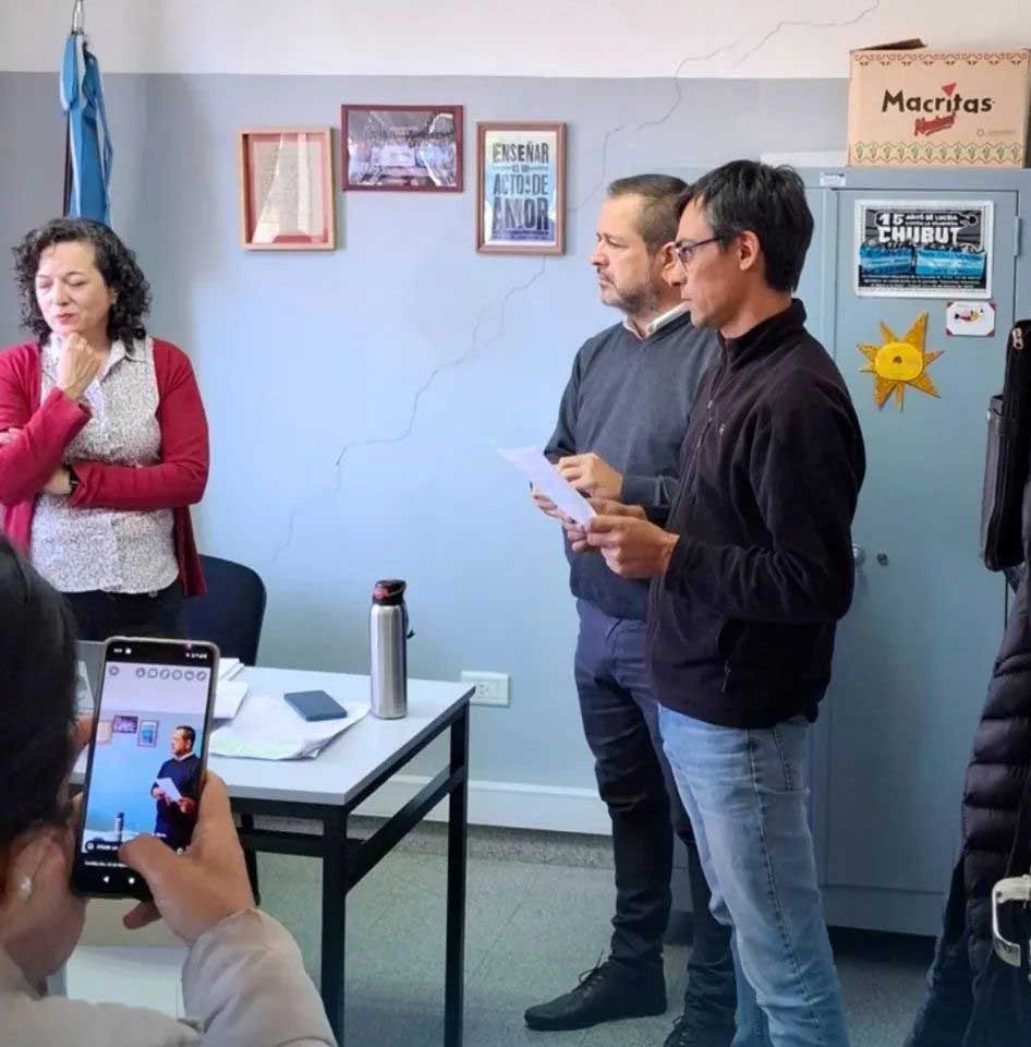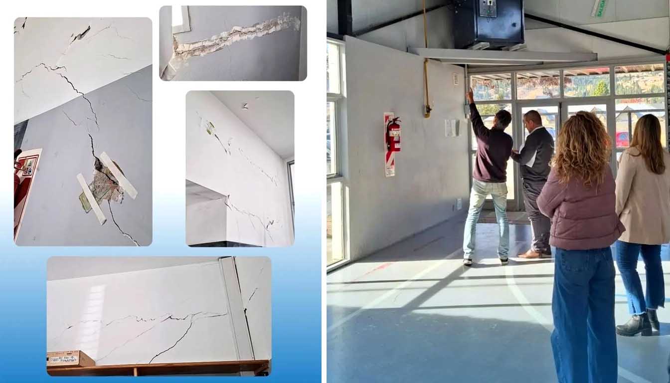 El concejal del bloque PJ Esquel, Martín Escalona, recorrió junto a familias la Escuela N° 7.722, para constatar en el lugar las grietas denunciadas y el estado general del edificio. También asistieron concejales del oficialismo.