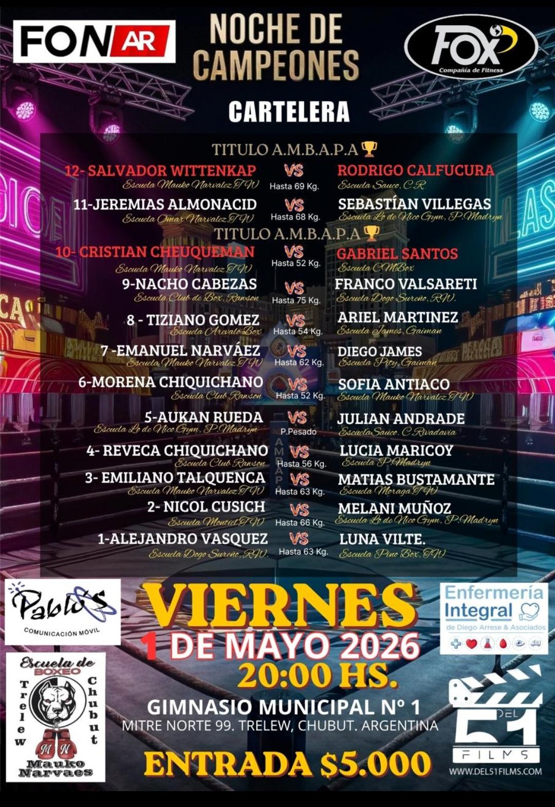 Salvador Wittenkap de la Escuela anfitriona de Mauko Narvaes expondrá el título AMBAPA (Asociación de Managers y Boxeadores Argentinos Profesionales y Amateurs) en los 69 kilos ante el comodorense Rodrigo Calfucurá.