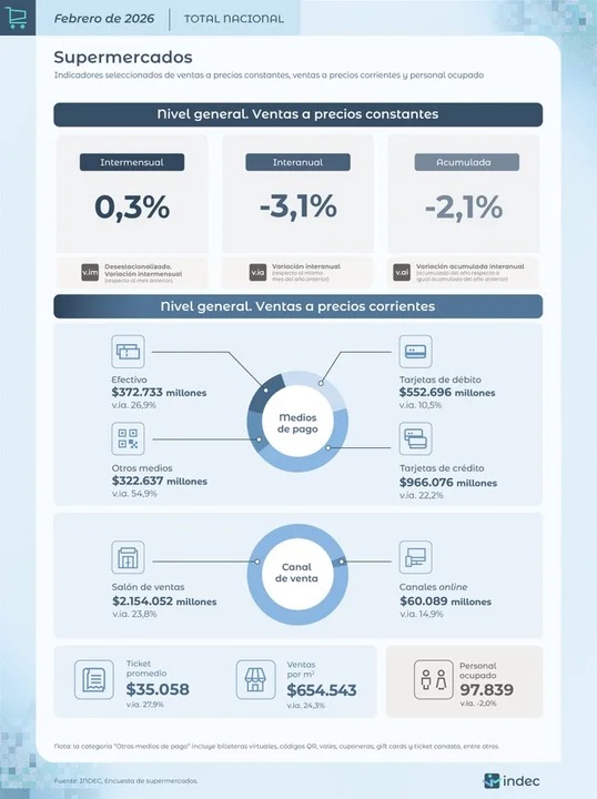 Si se toma en cuenta la medición contra el primer mes del 2026, las ventas aumentaron 0,3%, mientras que el índice de la serie tendencia-ciclo registró una variación negativa cercana a 0%.En números, las ventas totales a precios corrientes sumaron más de $2.214 millones y aumentaron 23,5% interanual. El ticket promedio fue de $35.058 (+27,9% contra febrero del 2025).