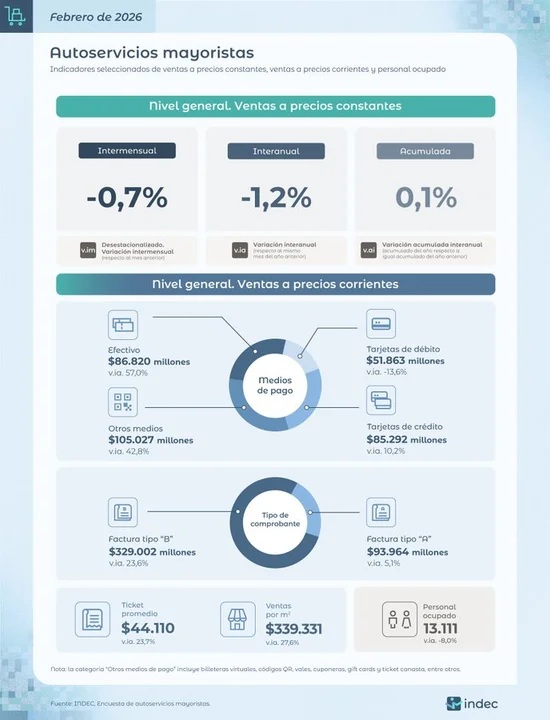 Las ventas en los autoservicios mayoristas cortaron la suba de enero y anotaron una merma de 1,2% interanual. El acumulado del año presentó un aumento de 0,1% respecto a igual período de 2025.Contra enero las ventas también cayeron 0,7%, mientras que en el índice serie tendencia-ciclo la variación fue del 0,5% mensual.Las ventas totales sumaron $329.001 millones (+23,6% interanual) y el ticket promedio fue de $44.110 (+23,7% interanual).