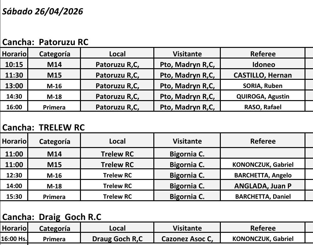 En el restante cotejo, Draig Goch será anfitrión de Cazones en Gaiman también desde las 16hs y el encargado de impartir justicia será Gabriel Kononczuk.
