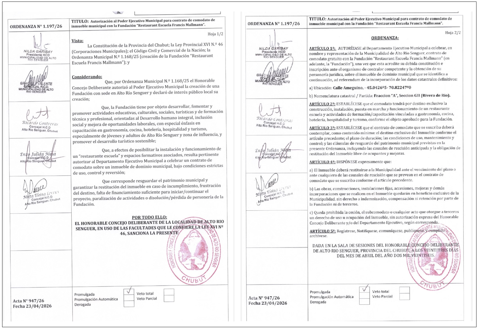 Mediante la Resolución N° 1129/26, el intendente de Río Senguer, Miguel Mongilardi, promulgó la Ordenanza N° 1.197/26 sancionada por el Concejo Deliberante local, mediante la cual se autoriza la firma de un contrato de comodato con la Fundación “Restaurant Escuela Francis Mallmann” para el uso de un inmueble municipal.