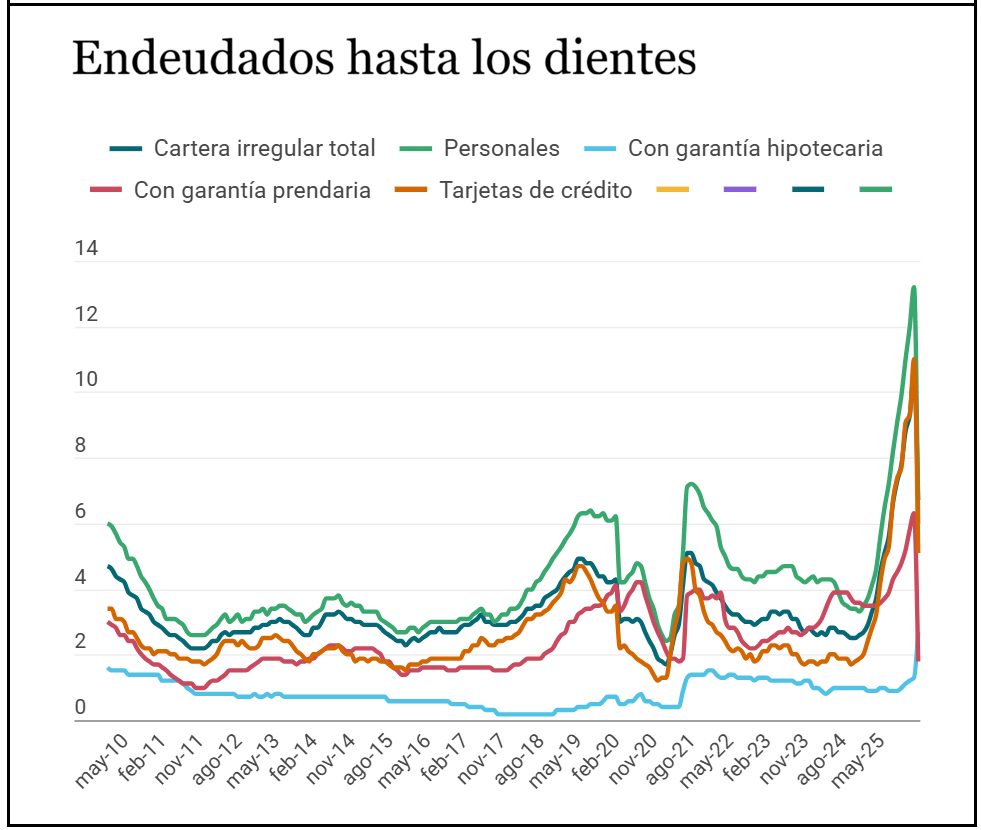 Otros segmentos presentan niveles menores pero en ascenso: los créditos prendarios alcanzaron 6,3% (+0,5 pp mensual) y los hipotecarios, aunque todavía contenidos, llegaron a 1,3%.