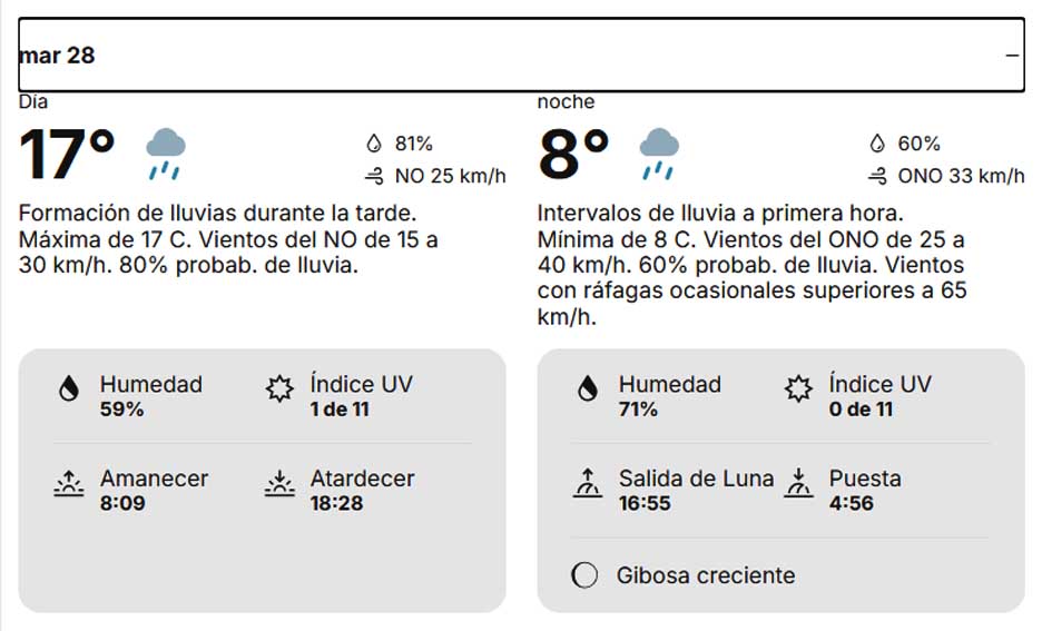 La formación de lluvias se producirá durante la tarde de este martes con un 81% de probabilidad. Por la noche, habrá intervalos de lluvias de un 60%. (Con información de Windy y The Weather Channel)#