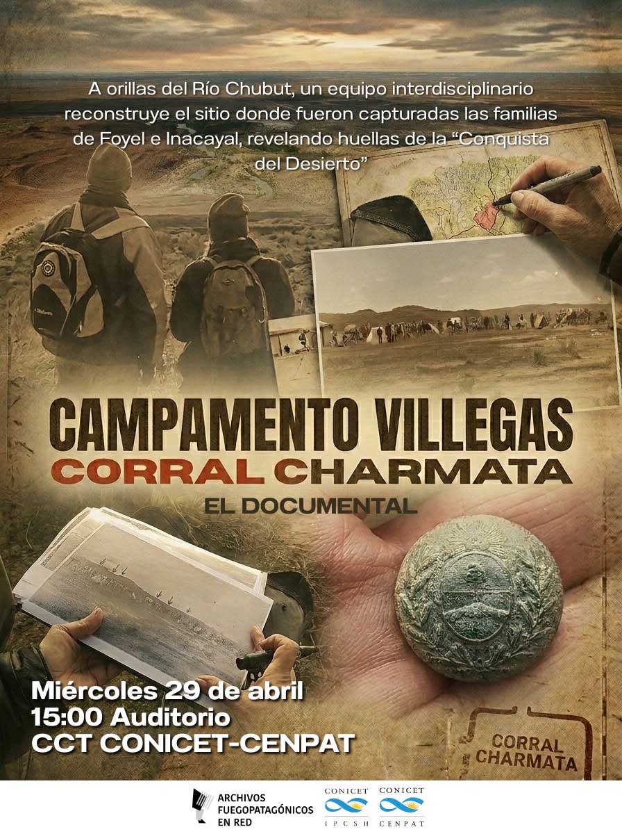 El Instituto Patagónico de Ciencias Sociales y Humanas “Dra. Florencia del Castillo Bernal” (IPCSH-CONICET) presentará, desde las 15 en el CENPAT, el documental “Campamento Villegas/Corral Charmata”, una producción que reconstruye un hallazgo histórico, arqueológico y geográfico en un recodo del Río Chubut, cercano a 28 de Julio, donde en 1883 la expedición comandada por Lino Oris de Roa mantuvo cautivas a más de 60 personas de los grupos de Foyel e Inacayal, antes de su traslado forzoso a la isla Martín García. El sitio, entonces territorio del cacique Sakamata, funcionaba como corral ganadero y punto de comercio vinculado a la Colonia Galesa.
